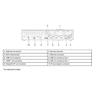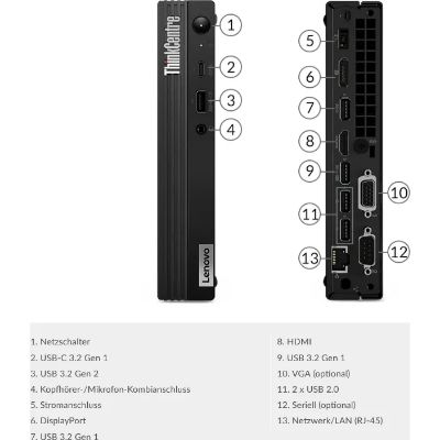 | Anschlüsse | Hinten: 1x USB-A 3.0 (5Gb/s), 3x USB-A 2.0 (480Mb/s), 1x HDMI 2.1, 1x DisplayPort 1.4, 1x RJ-45 (1000Base-T), 1x DC-In Lenovo Slim Tip (Netzanschluss), Hinten: 2x USB-A 3.0 (5Gb/s), 2x USB-A 2.0 (480Mb/s), 1x HDMI 1.4, 1x DisplayPort 1.2, 1x RJ-45 (1000Base-T, Realtek RTL8111FP, DASH), 1x DC-In Lenovo Slim Tip (Netzanschluss), Vorne/seitlich: 1x USB-C 3.0 (5Gb/s), 1x USB-A 3.1 (10Gb/s, BC), 1x 3.5mm Klinke (Realtek ALC222), Vorne/seitlich: 1x USB-C 3.0 (5Gb/s), 1x USB-A 3.1 (10Gb/s), 1x USB-A 3.0 (5Gb/s), 1x 3.5mm Klinke (Realtek ALC222) |